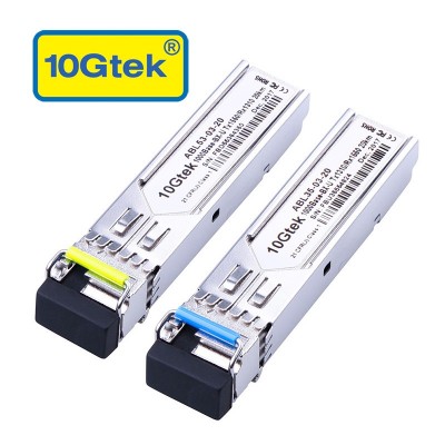 10Gtek's SFP-FE-BD-20-U/D (pair) is a pair of 100Base SFP BiDi transceivers, supporting up to 10~20 km over single LC SMF fiber, following SFP MSA 100Base-LX. These BiDi SFP transceivers consists of driver IC, eeprom I2C, Tx1310nm FP or Tx1550nm FP laser, PIN-(tia) base on BOSA technologic.